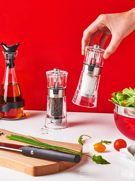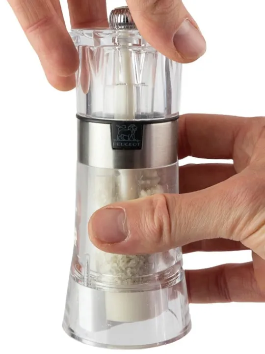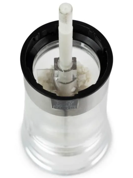 The Oslo wet salt mill is a perfect example of Peugeot expertise. It is equipped with an exclusive ceramic mechanism produced in France. Its innovative patented system provides excellent grinding performance whilst its helical blade mixes the salt and guarantees a constant flow of salt. The acrylic body of the Oslo mill clearly shows the salt that it holds, the faceted head attracts the light… as beautiful as it is functional, this mill is already an essential for modern dining.